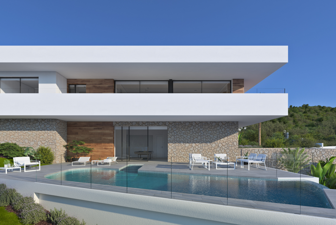 La Villa Brisa del Mar, située sur un terrain privilégié de l’exclusif Residencial Jazmines, à proximité de Moraira, se distingue par son architecture contemporaine aux lignes épurées, qui s’intègre parfaitement à l’environnement naturel de la côte méditerranéenne. Sa façade joue avec la combinaison de matériaux nobles comme la pierre et le bois, apportant chaleur et caractère, en contraste avec le blanc immaculé de ses volumes purs.