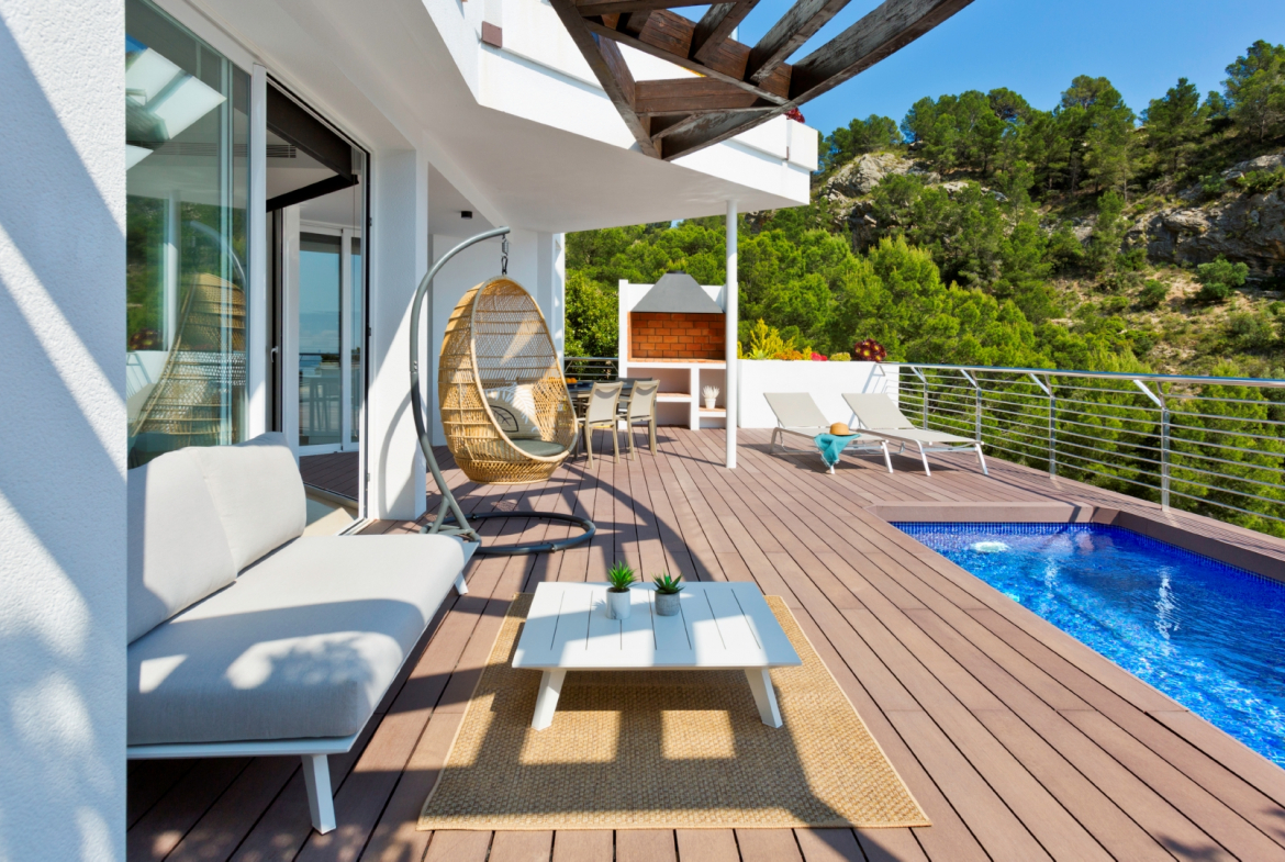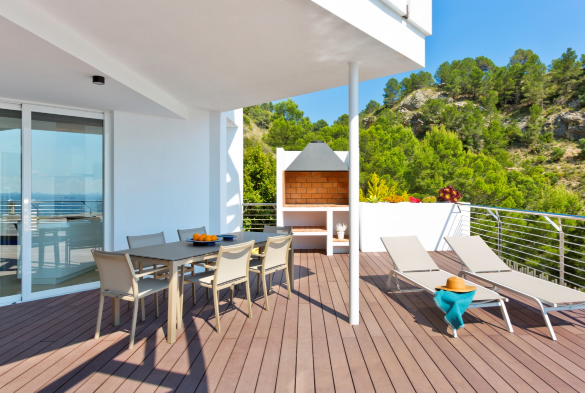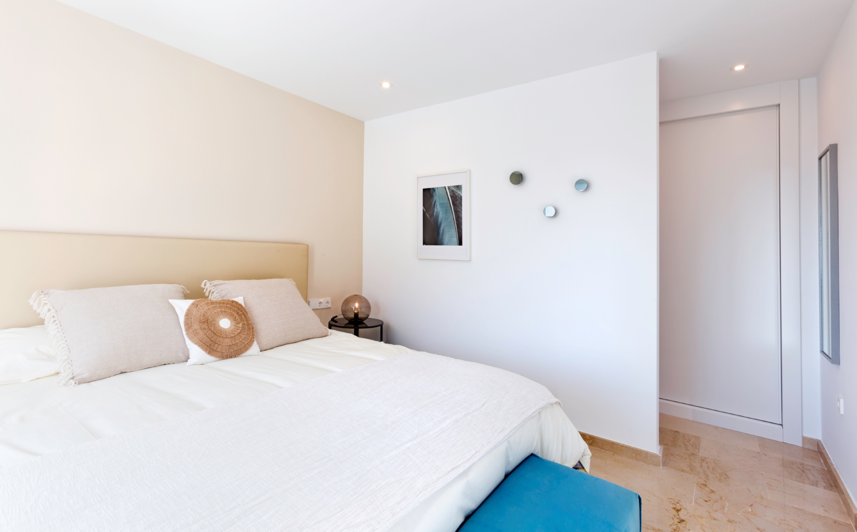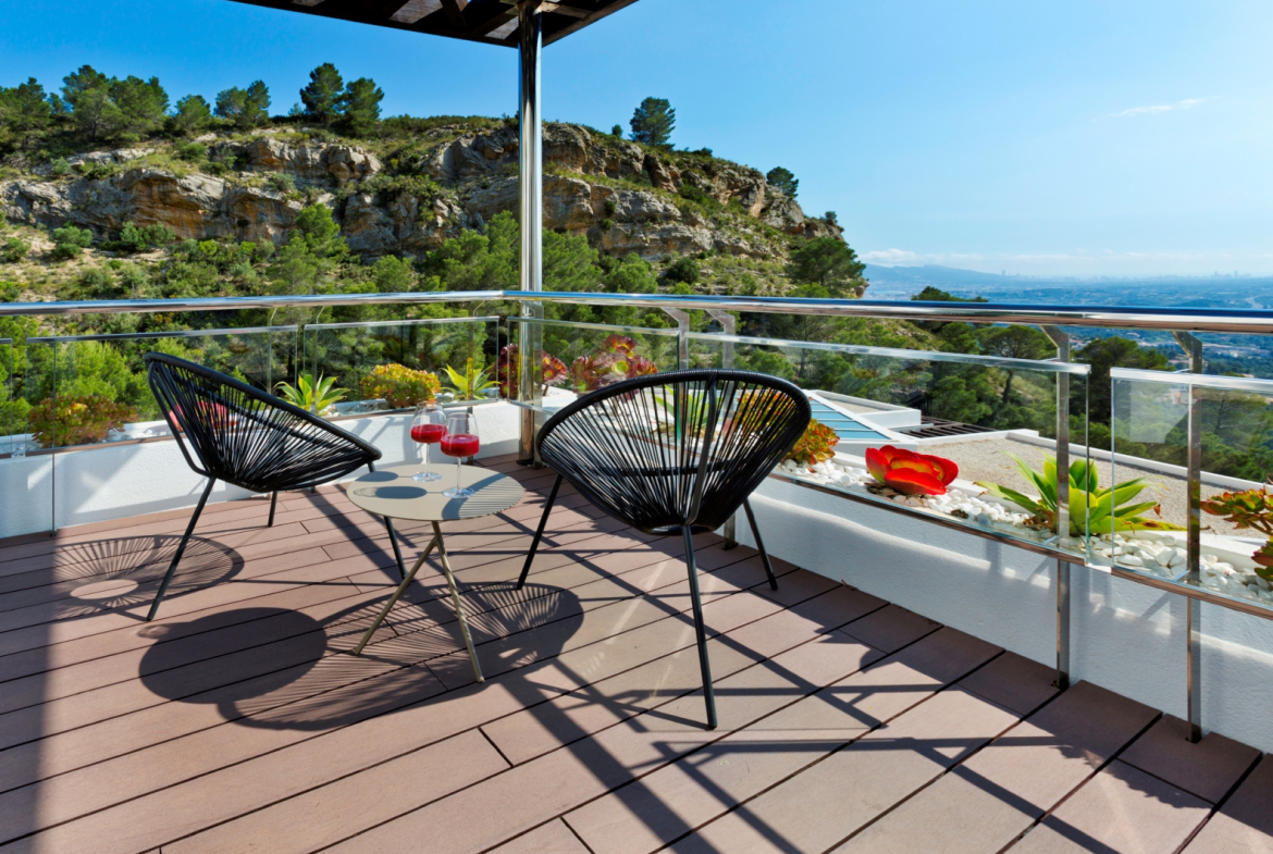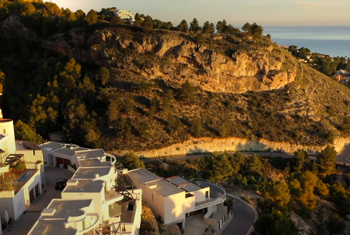 Residencial lleno de luz con grandes espacios interiores, arquitectura única y un entorno natural con una vista panorámica del Mar Mediterráneo y al skyline de Benidorm.