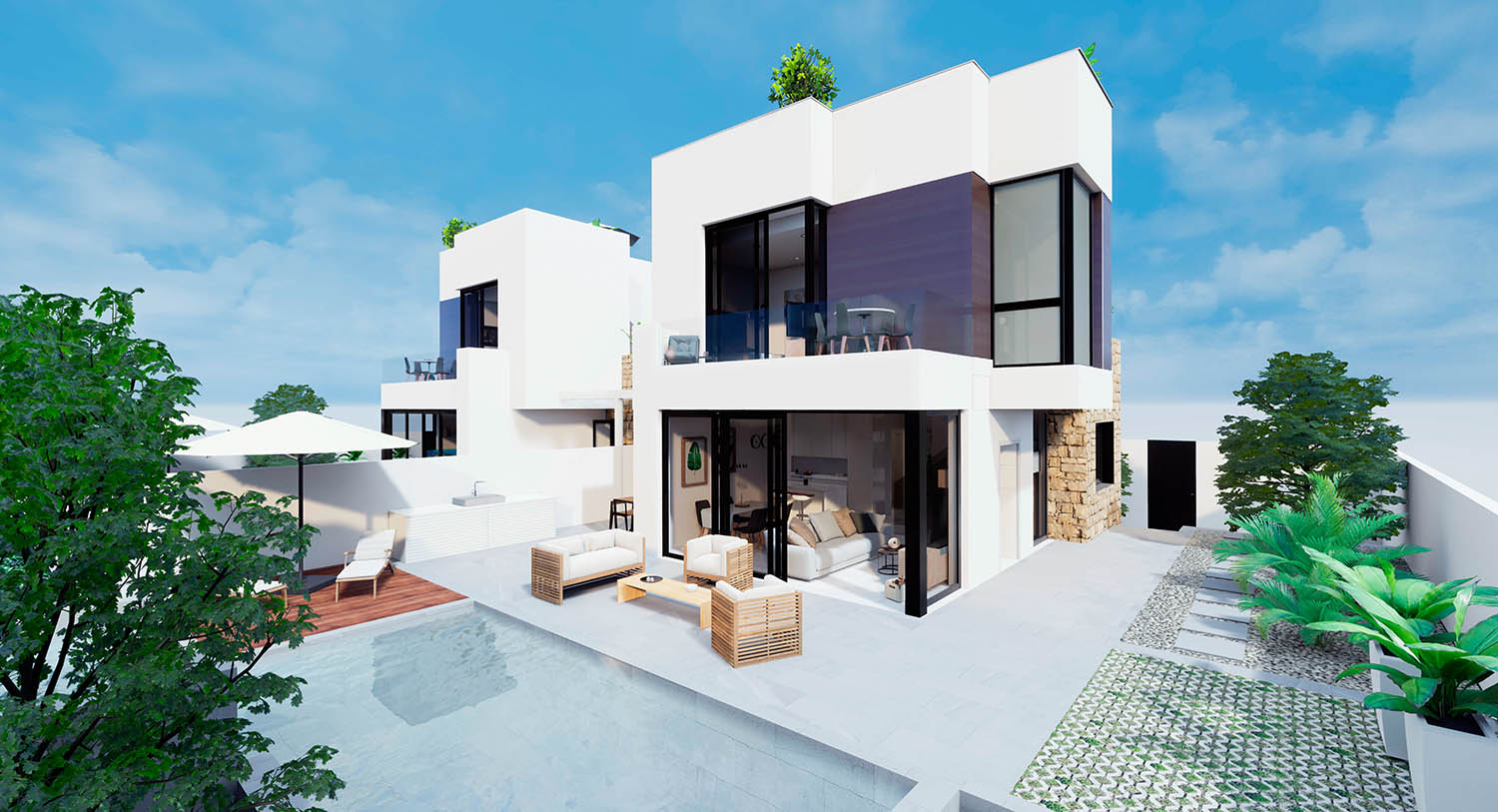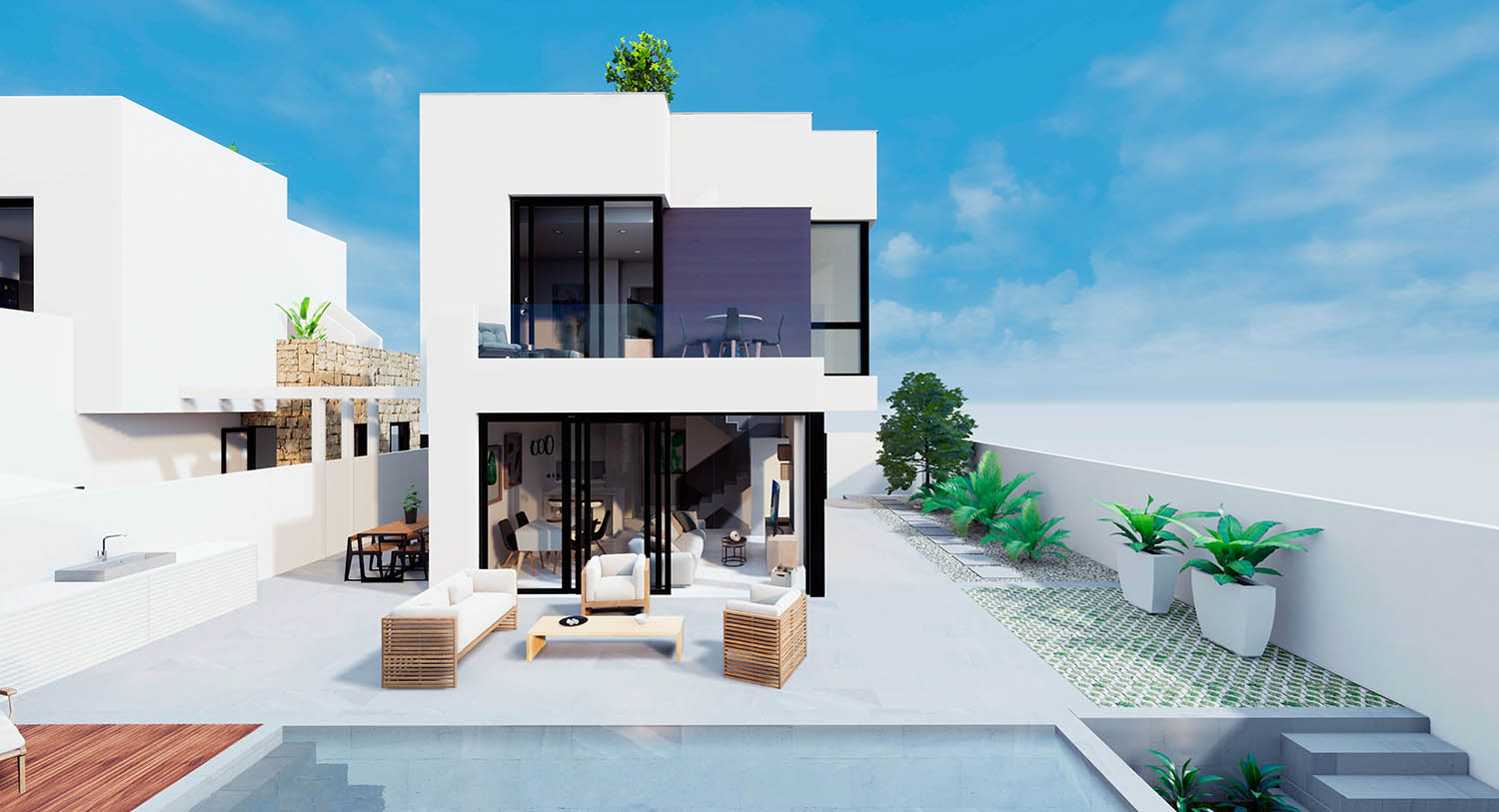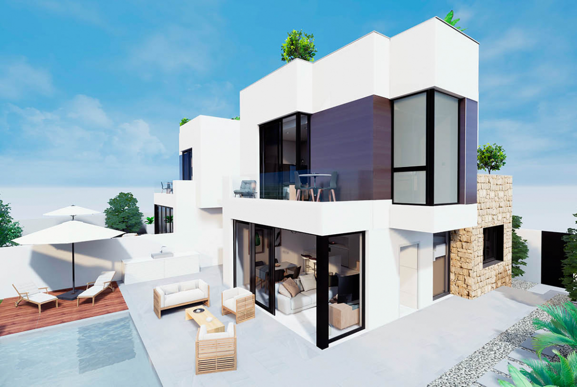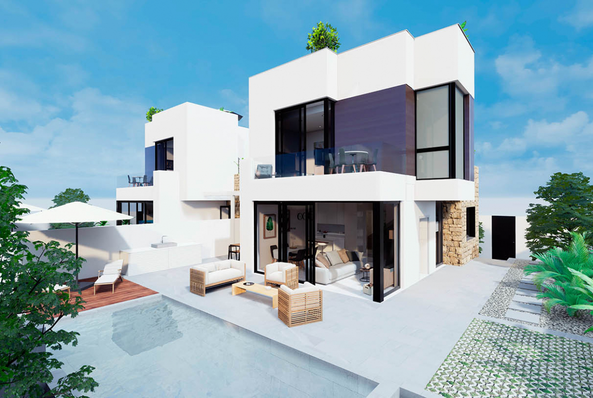 3 villas situadas en el distrito de Aguas Nuevas (Torrevieja) 150 metros cuadrados distribuidos en 3 dormitorios , 2 baños y un gran salon/cocina. Las parcelas son de 300 metros cuadrados. Visas abiertas desde el salon a la piscina, jacuzzi y cascada. Gran solarium con barbacoa en planta alta.