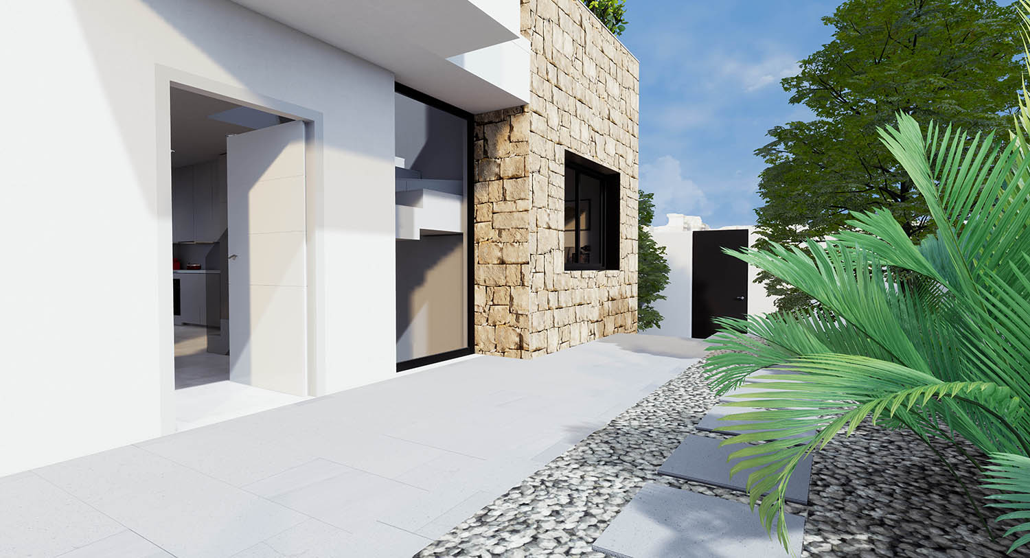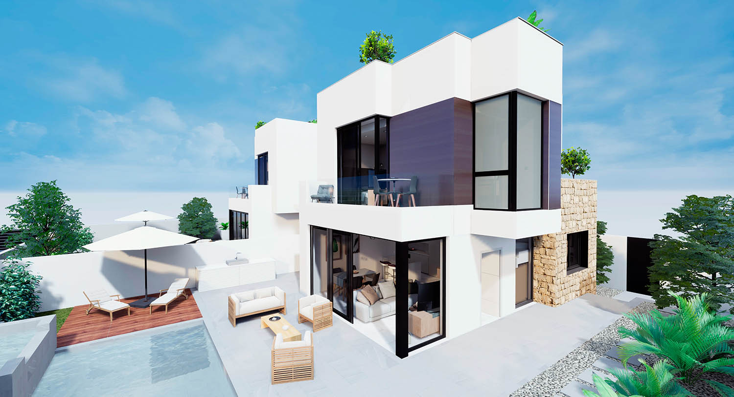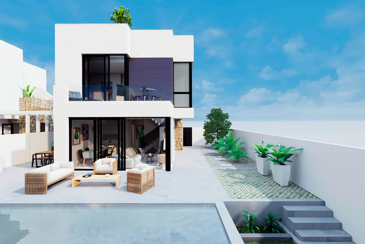 3 villas situadas en el distrito de Aguas Nuevas (Torrevieja) 150 metros cuadrados distribuidos en 3 dormitorios , 2 baños y un gran salon/cocina. Las parcelas son de 300 metros cuadrados. Visas abiertas desde el salon a la piscina, jacuzzi y cascada. Gran solarium con barbacoa en planta alta.